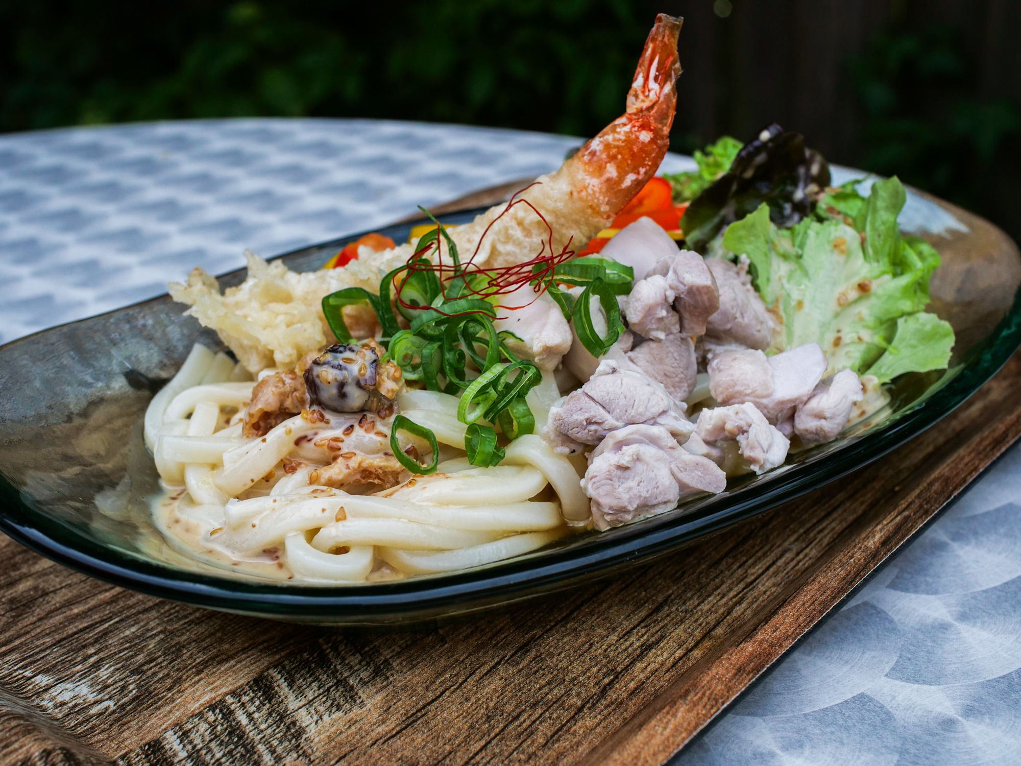 It’s a fresh fusion of lettuce, paprika, hearty diced chicken on a bed of perfectly cooked udon, and drizzled with a lovely sesame dressing. The crunchy shrimp tempura is optional but I added it as a treat.