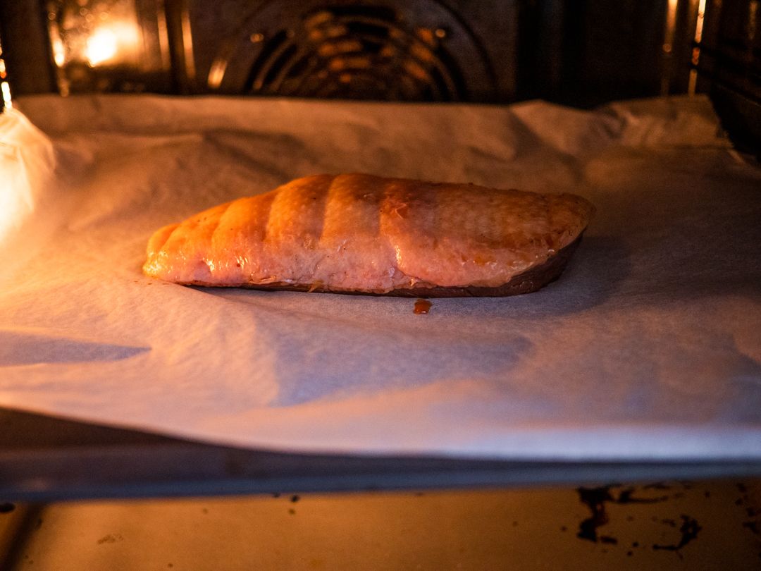 Then, place the duck filet in the oven and monitor the duck filet until the skin is crispy and golden brown. Depending on the thickness of the filet, it should take about 30min. You can remove the fat in between (but don’t throw it away, it’s delicious to use it for fried rice! But be careful the fat will be scorching hot!